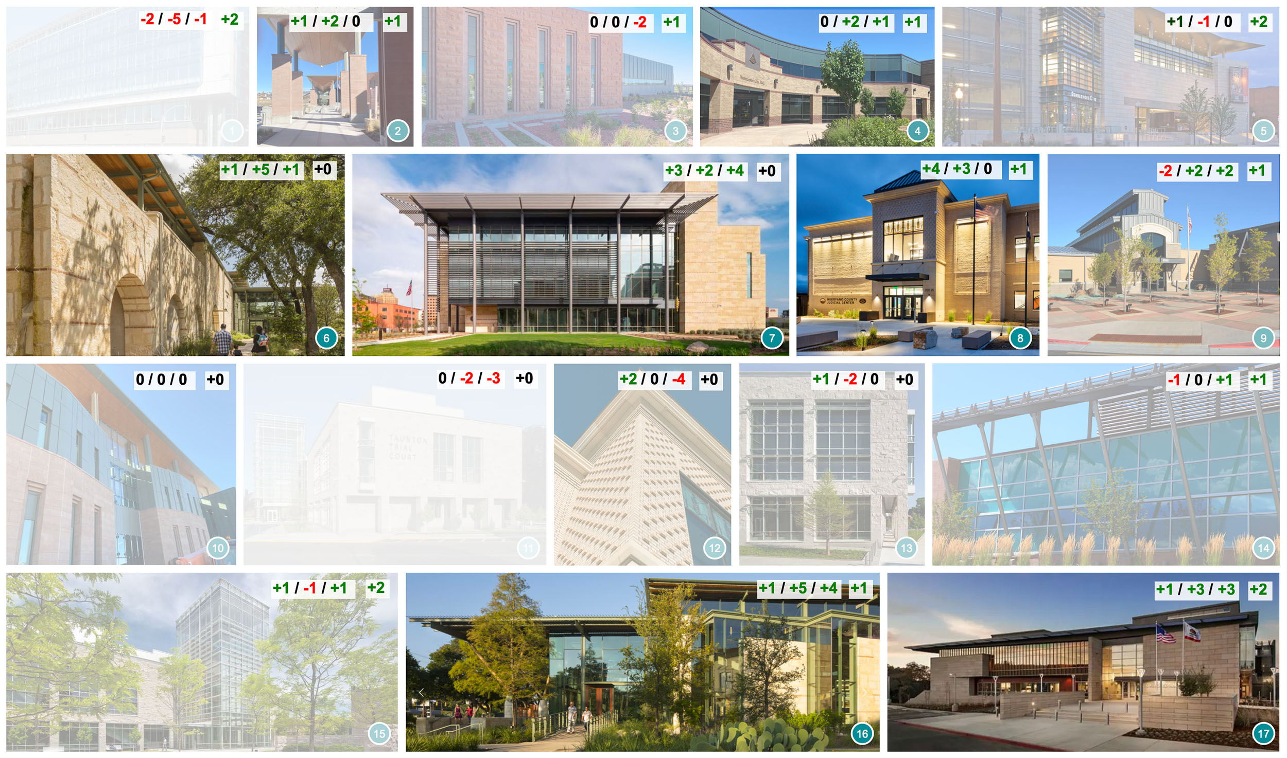 Numbers (+/-) on images represent positive (green) and negative (red) feedback across several groups including executive committee, and community advisory team members.